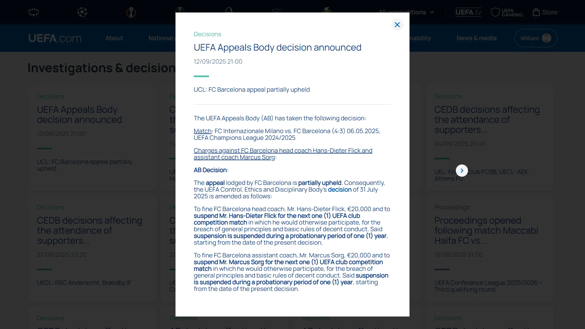 虎扑09月12日讯 欧足联上诉委员会宣布,部分采纳巴塞罗那足球俱乐部的上诉,将对巴萨主教练弗里克的欧战停赛1场处罚暂缓1年,但20000欧罚款维持不变。